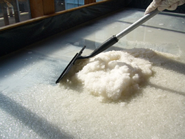 - 採取した塩を漉して「にがり」と分けた後、遠心脱水工程へ移ります。完全に